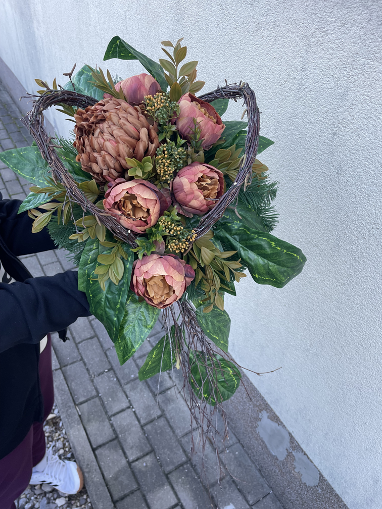 Podczas zajęć uczniowie tworzyli kompozycje w zabetonowanych podstawach, co zapewniało trwałość i stabilność prac. Do wykonania stroików wykorzystano sztuczne kwiaty, jednak najważniejszym i najbardziej charakterystycznym elementem była ręcznie wykonana konstrukcja z plecionych gałęzi brzozy, która nadawała każdej kompozycji naturalny, rustykalny charakter.
