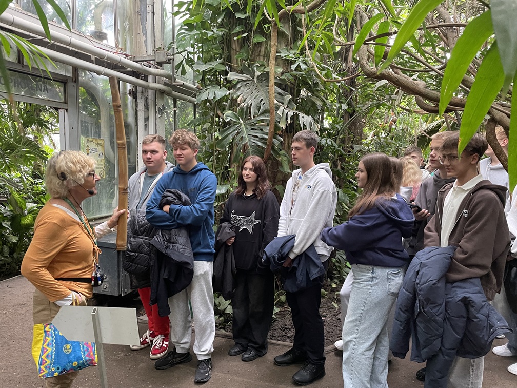 Nasza przygoda rozpoczęła się w sercu Poznania — w malowniczym Parku Wilsona, gdzie od ponad stu lat znajduje się Palmiarnia Poznańska. Pod opieką przewodnika uczniowie przeszli przez wiele pawilonów, każdy z nich prezentujący roślinność z różnych stref klimatycznych. Wśród eksponowanych można wyróżnić:
