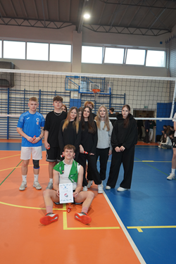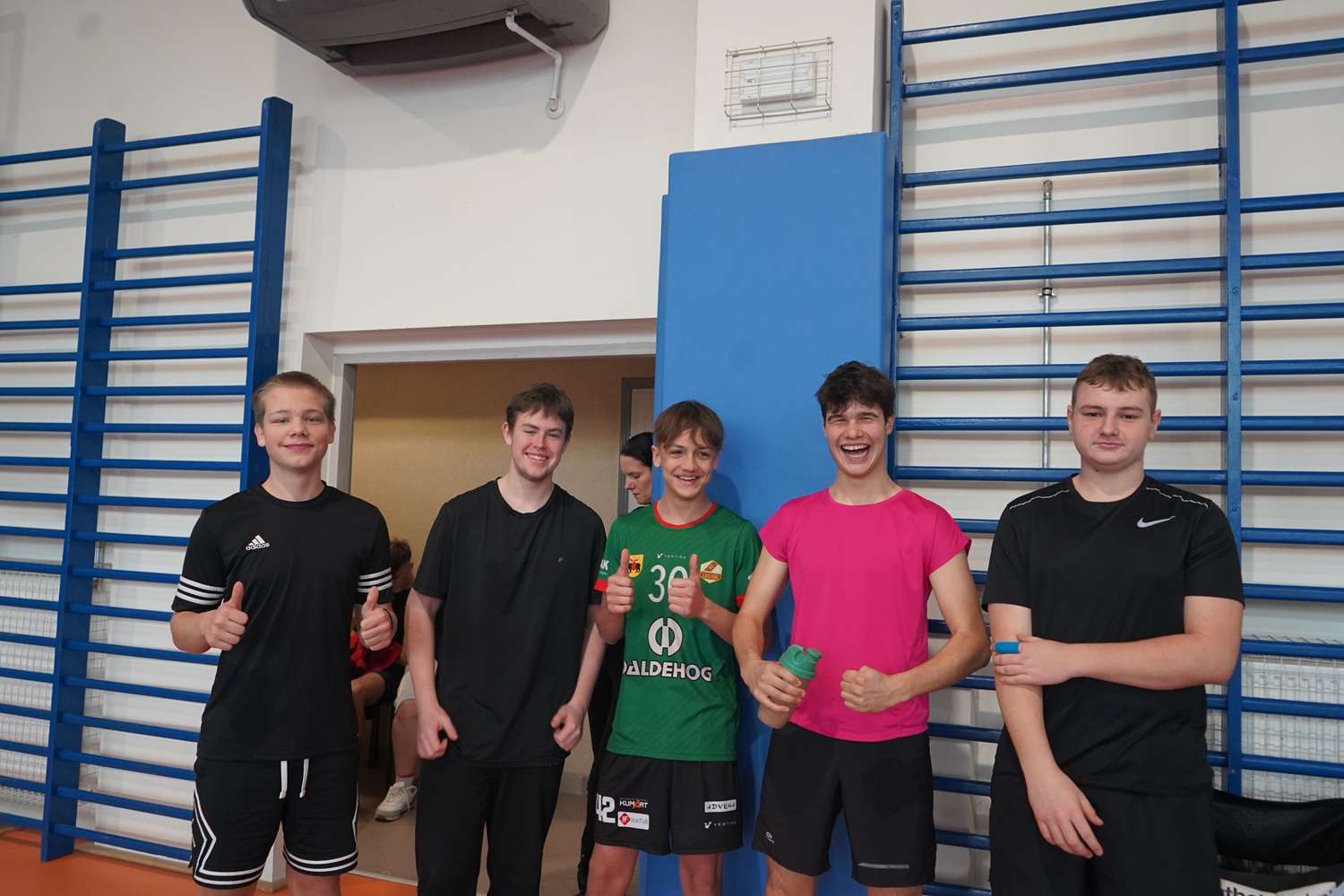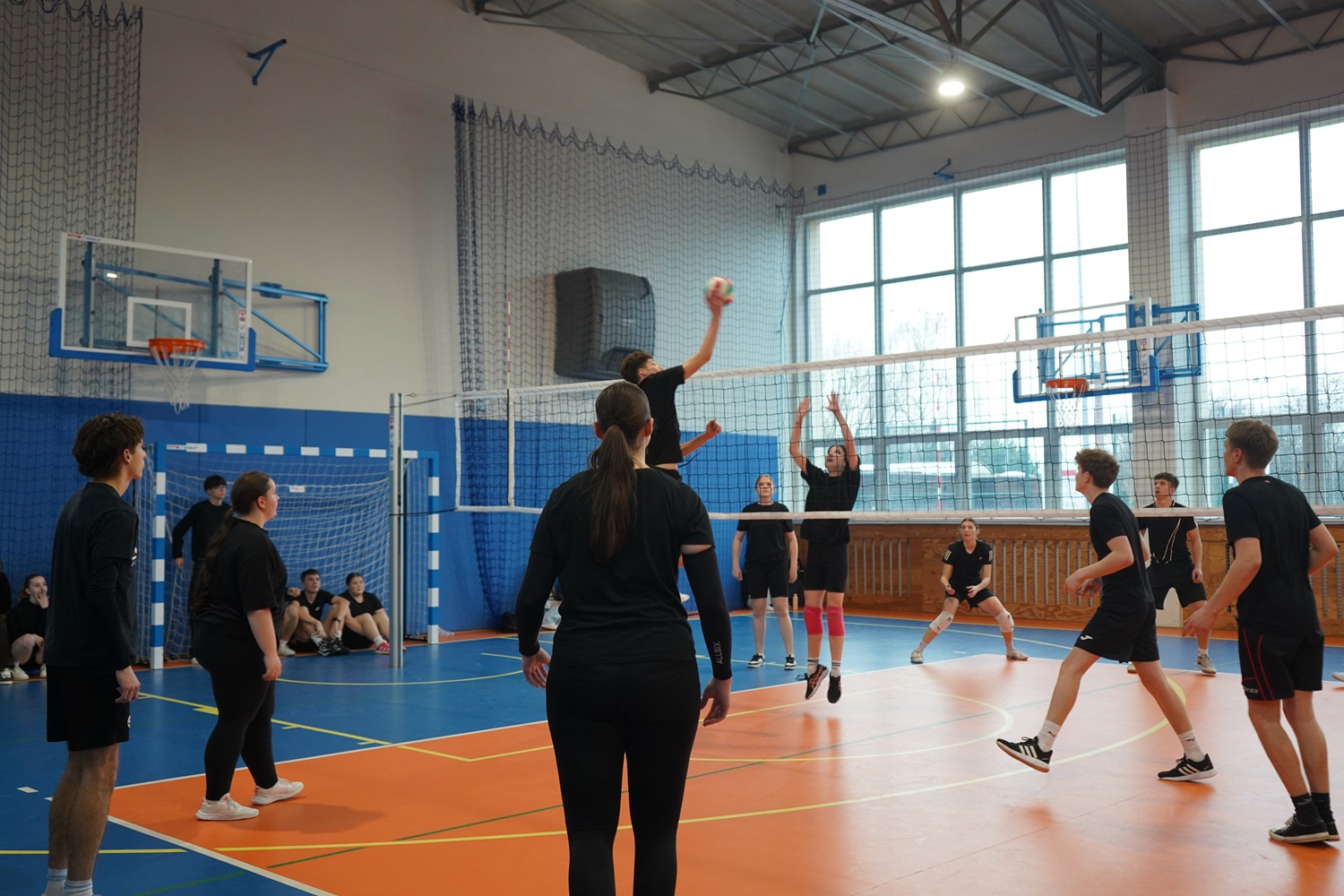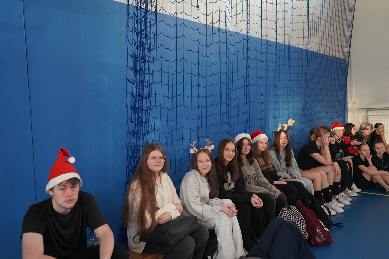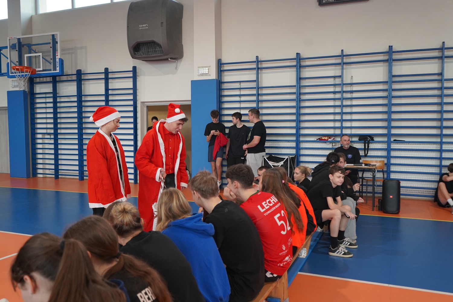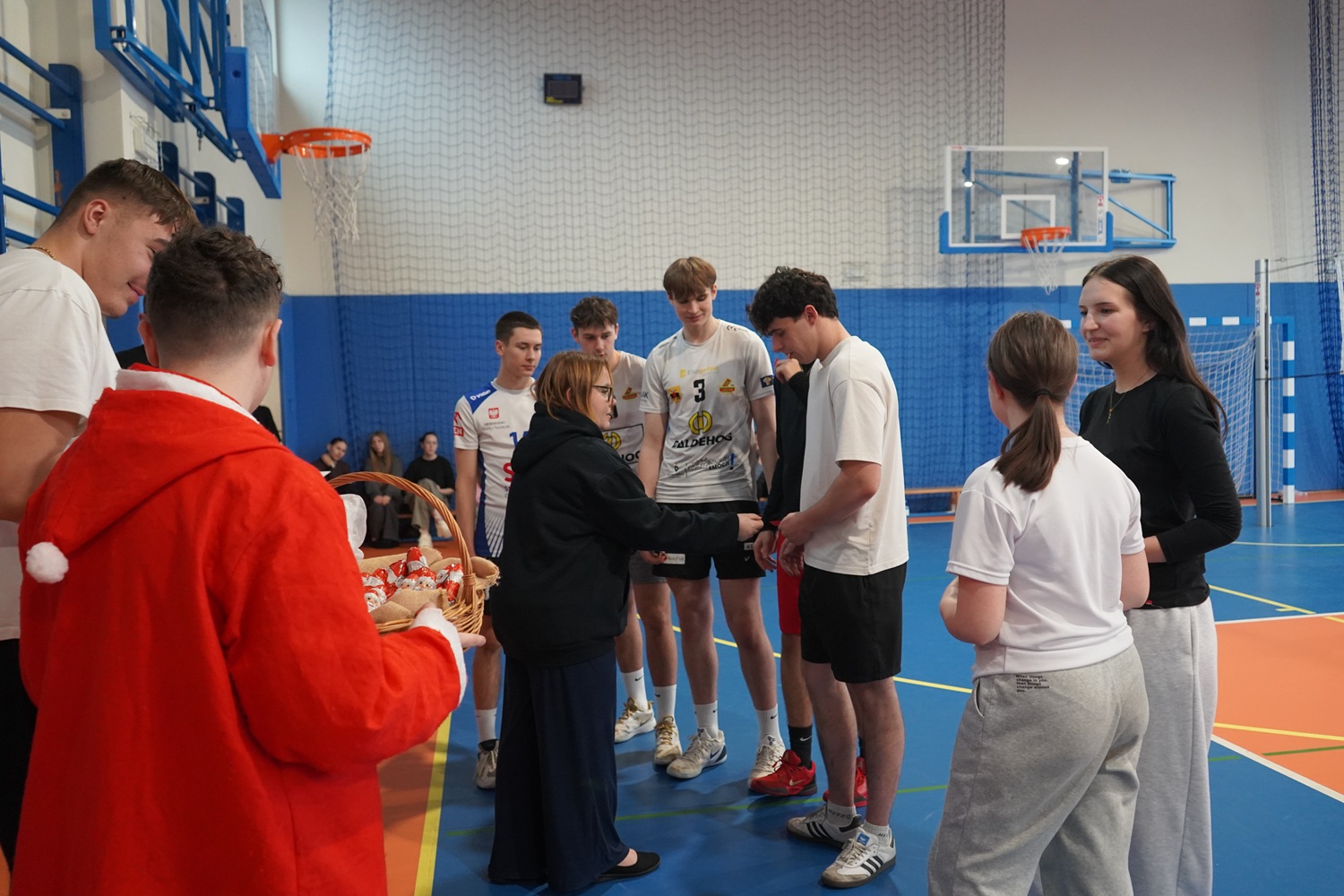 8 grudnia 2025r w naszej szkole odbył się Mikołajkowy Turniej Piłki Siatkowej, który już tradycyjnie połączył sportową rywalizację z magiczną atmosferą nadchodzących świąt. Do zmagań przystąpiło aż 20 klas, co świadczy o ogromnym zainteresowaniu i aktywności naszych uczniów.Drużyny zostały przydzielone do 4 grup eliminacyjnych, w których rywalizowano systemem „każdy z każdym”. Emocji nie brakowało – mecze były zacięte, pełne zwrotów akcji i efektownych wymian. Po zakończeniu rozgrywek grupowych poznaliśmy najlepsze zespoły, które awansowały do ścisłego finału. Łącznie rozegraliśmy 46 spotkań, co z pewnością pokazuje, jak intensywne były rozgrywki, ale również jak wysoki poziom sportowy zaprezentowali nasi uczniowie. Wyjątkowego charakteru wydarzeniu nadał obecny na sali Mikołaj z Samorządu Uczniowskiego, który w czasie turnieju częstował uczestników świątecznymi słodkościami – dodając uśmiechu i motywacji do sportowej rywalizacji.Miłym akcentem turnieju była również obecność naszych absolwentów, Daniela Wysokińskiego i Łukasza Wojtaszka, którzy odwiedzili szkołę, aby kibicować młodszym kolegom. Cieszymy się, że sportowe tradycje naszej szkoły są dla nich wciąż bliskie i że chętnie wracają, by wspierać kolejne pokolenia sportowców.