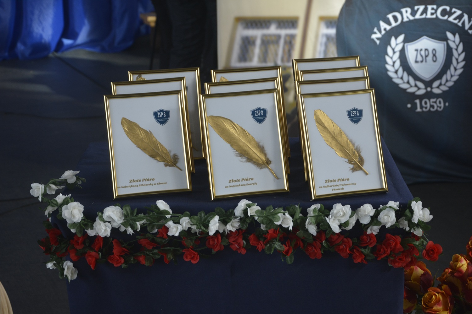 Następnie przyszedł czas na pełen humoru i serdeczności punkt programu – galę wręczenia „Złotych Piór”, podczas której Samorząd Uczniowski nagrodził nauczycieli w nietypowych, żartobliwych kategoriach. Nie zabrakło braw, śmiechu i wzruszenia. Nagrodę specjalną – Złote Pióro za najlepszą reżyserię szkolnego życia – otrzymała Pani Dyrektor Agnieszka Dziedzic.