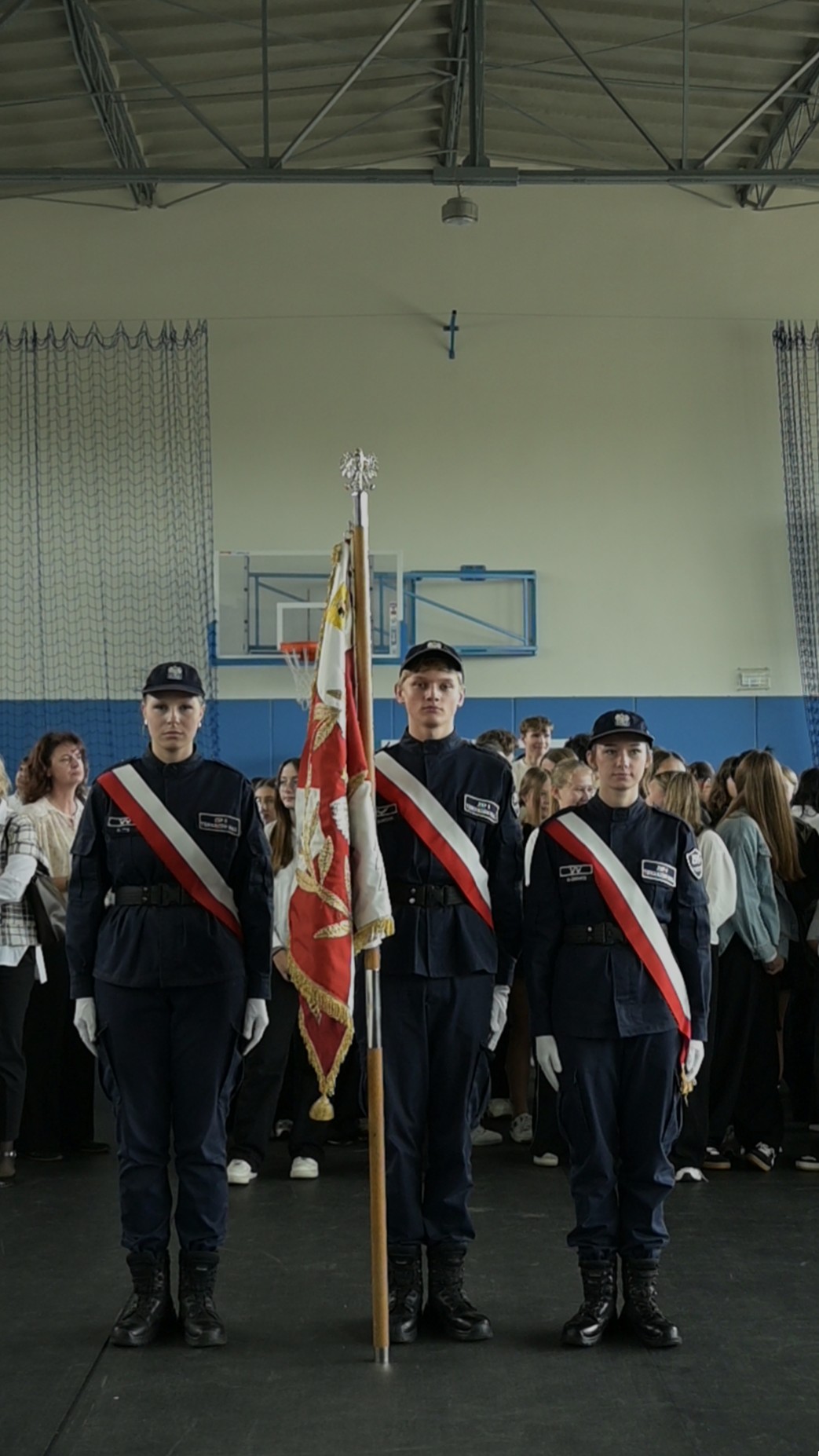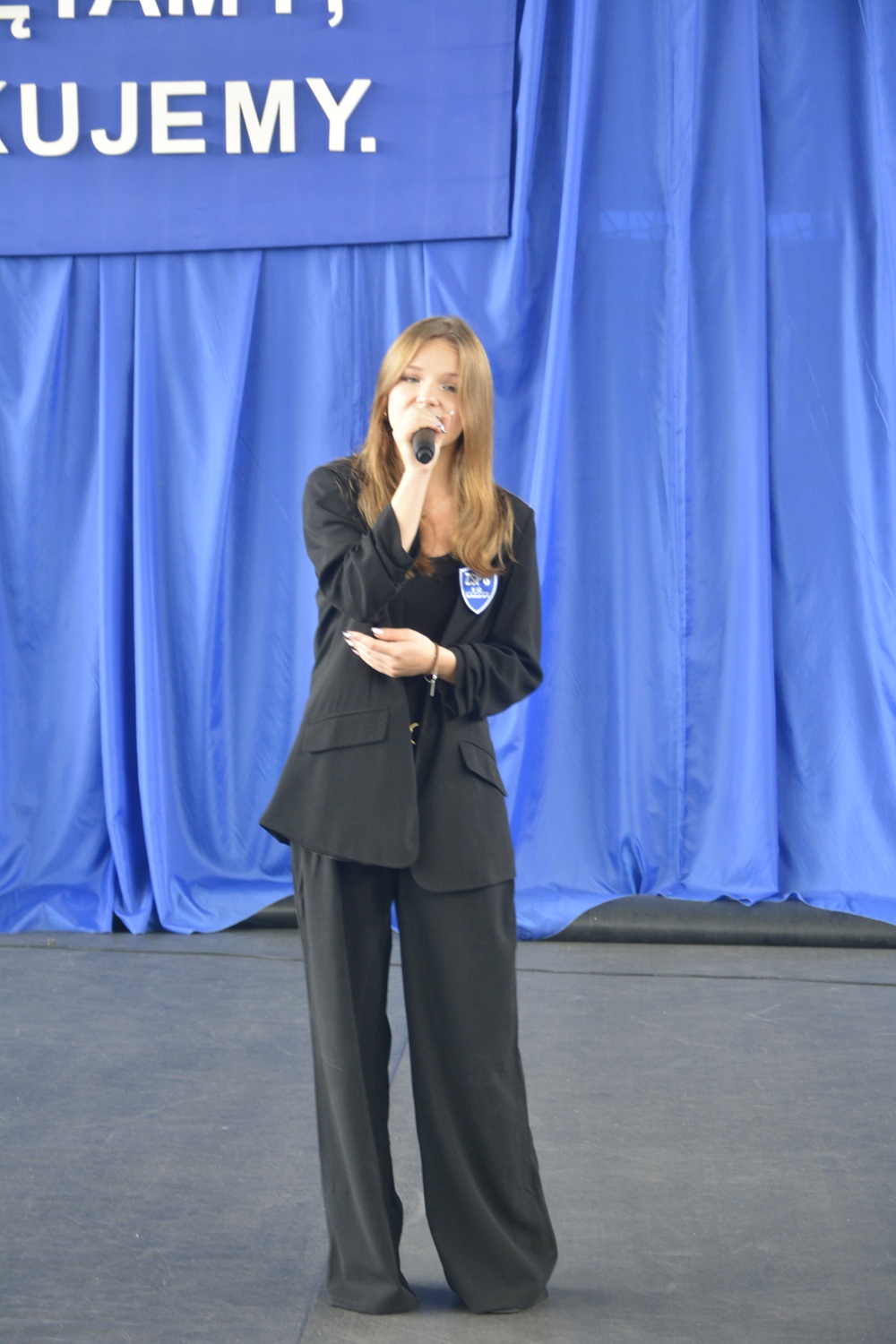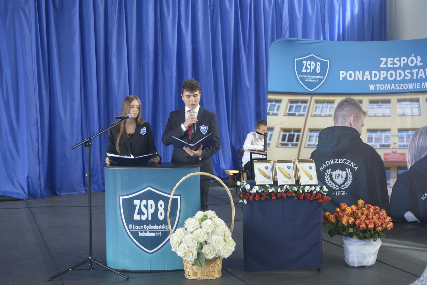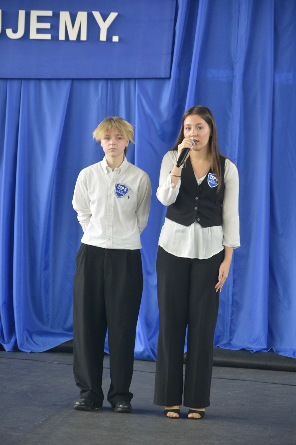 Uroczystość poprowadzili Adrian Sobierski i Aleksandra Czapnik, którzy przywitali Panią Dyrektor Agnieszkę Dziedzic, nauczycieli, pracowników szkoły, uczniów oraz zaproszonych gości. W słowach otwierających podkreślili znaczenie wspólnoty szkolnej opartej na wartościach, tradycji i szacunku.